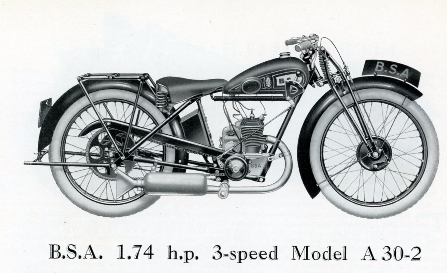 A30-2 or 1.74 h.p. 3-speed. This was the last year for this early BSA two stroke experiment which started in 1928. It never became a big success. |