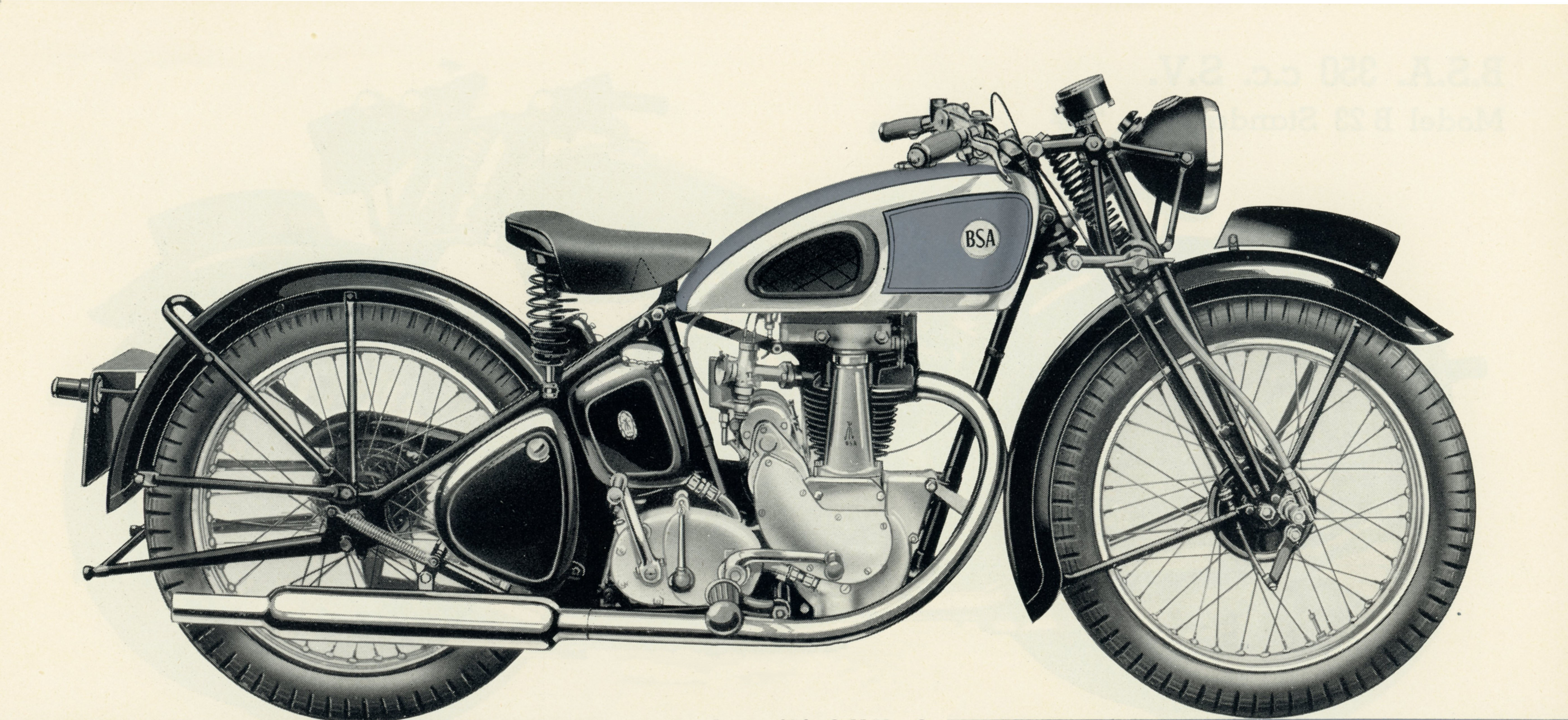 B23 Standard or 350 c.c. S.V. The basic model 350cc SV. | black frame, matt silver petrol tank lined in red and black, hand change gearbox. |