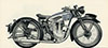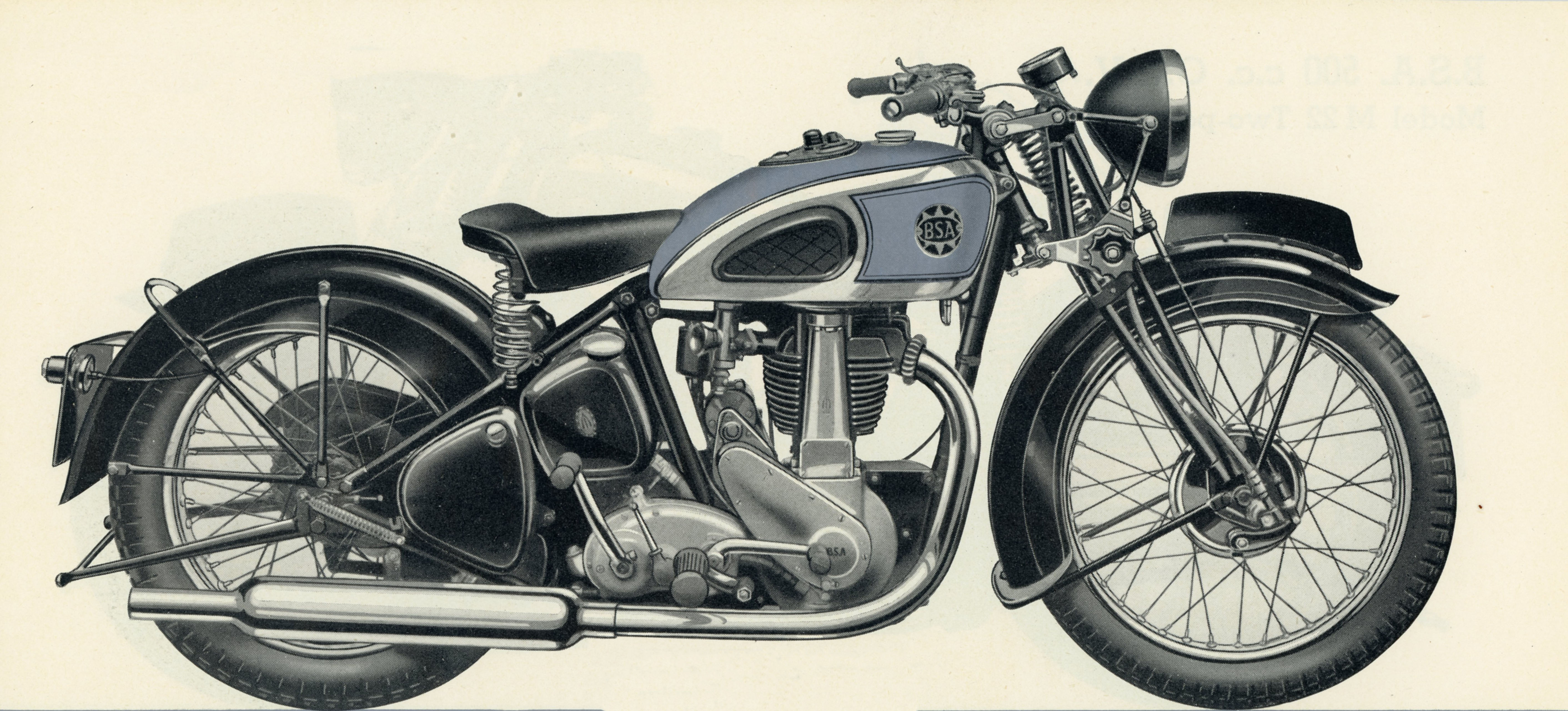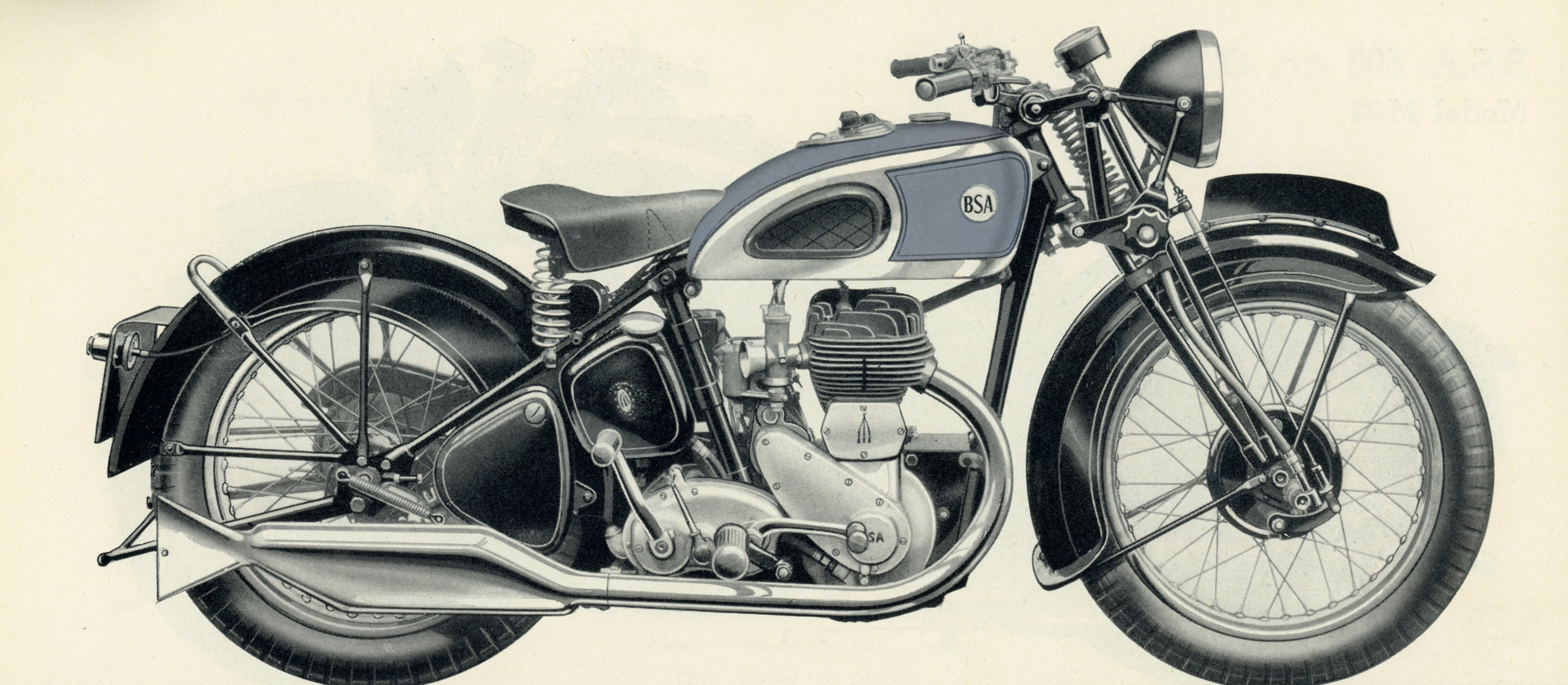 M22 or 500 c.c. O.H.V. The basic model 500cc OHV. | black frame, chrome plated petrol tank with matt silver panels lined in red and black with instrument panel, 1938 type engine, fishtail exhaust, foot change gearbox. |