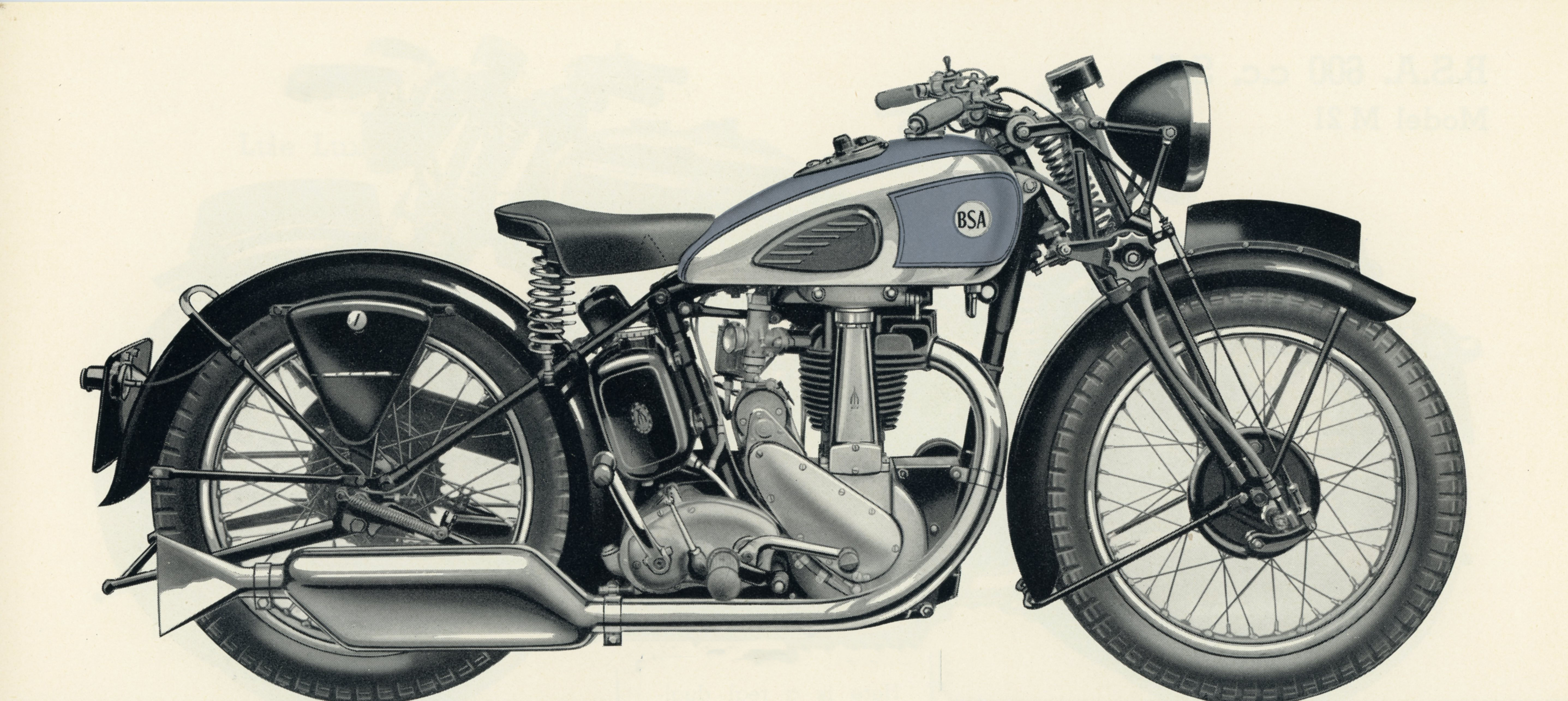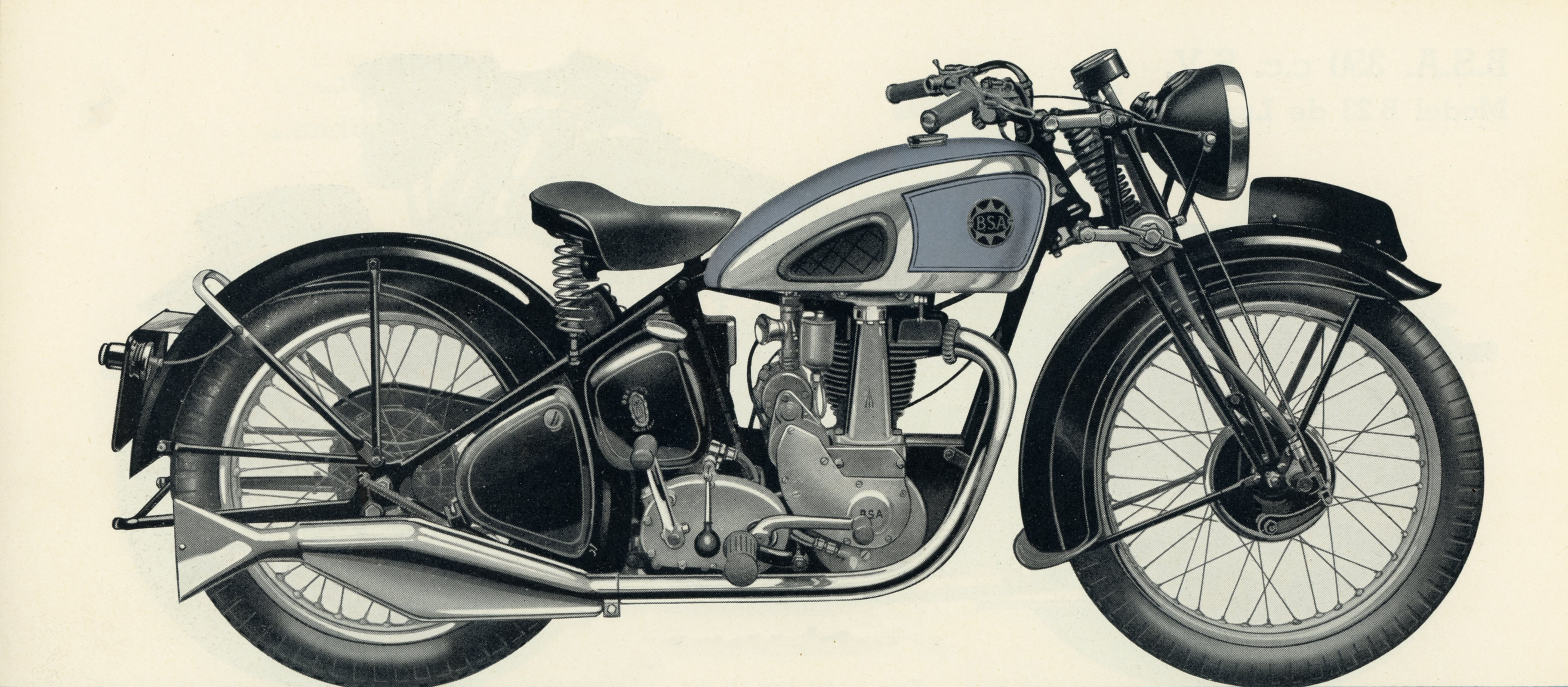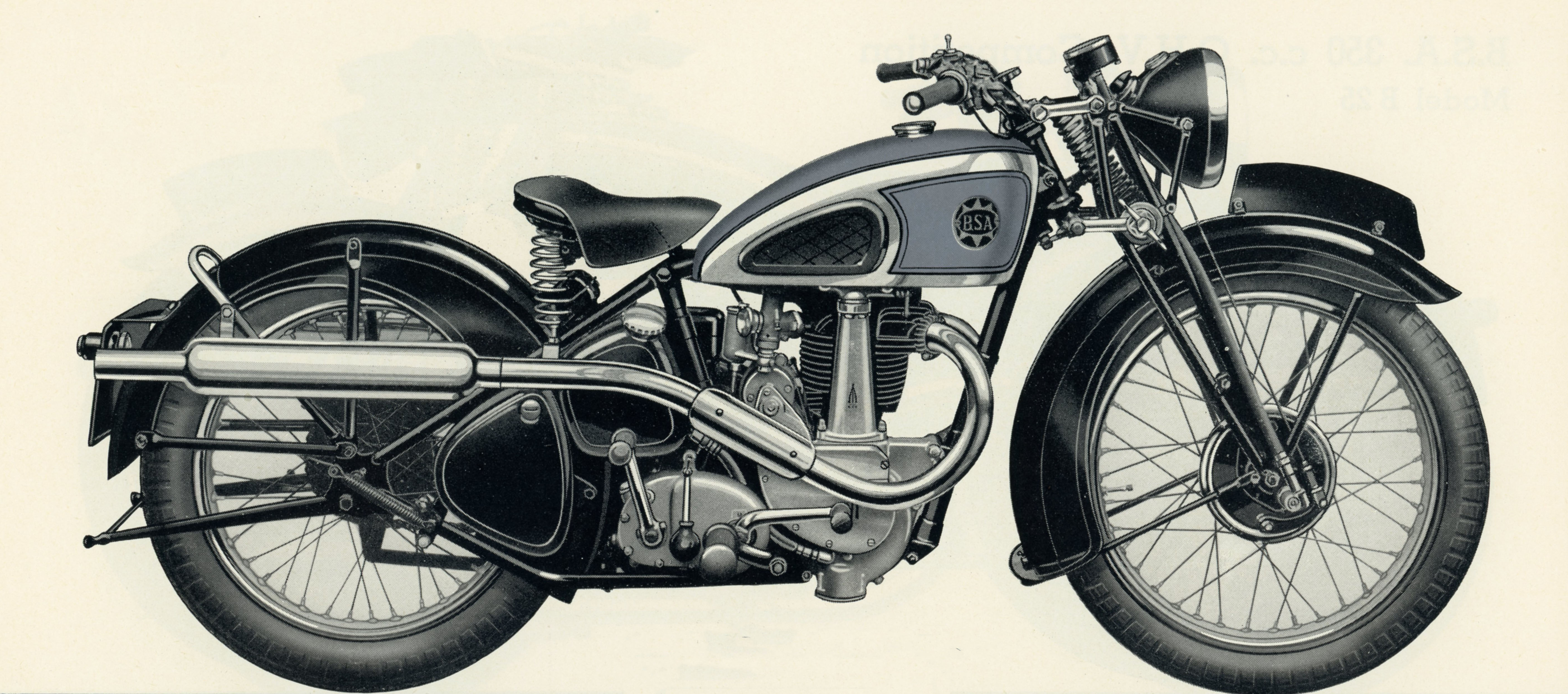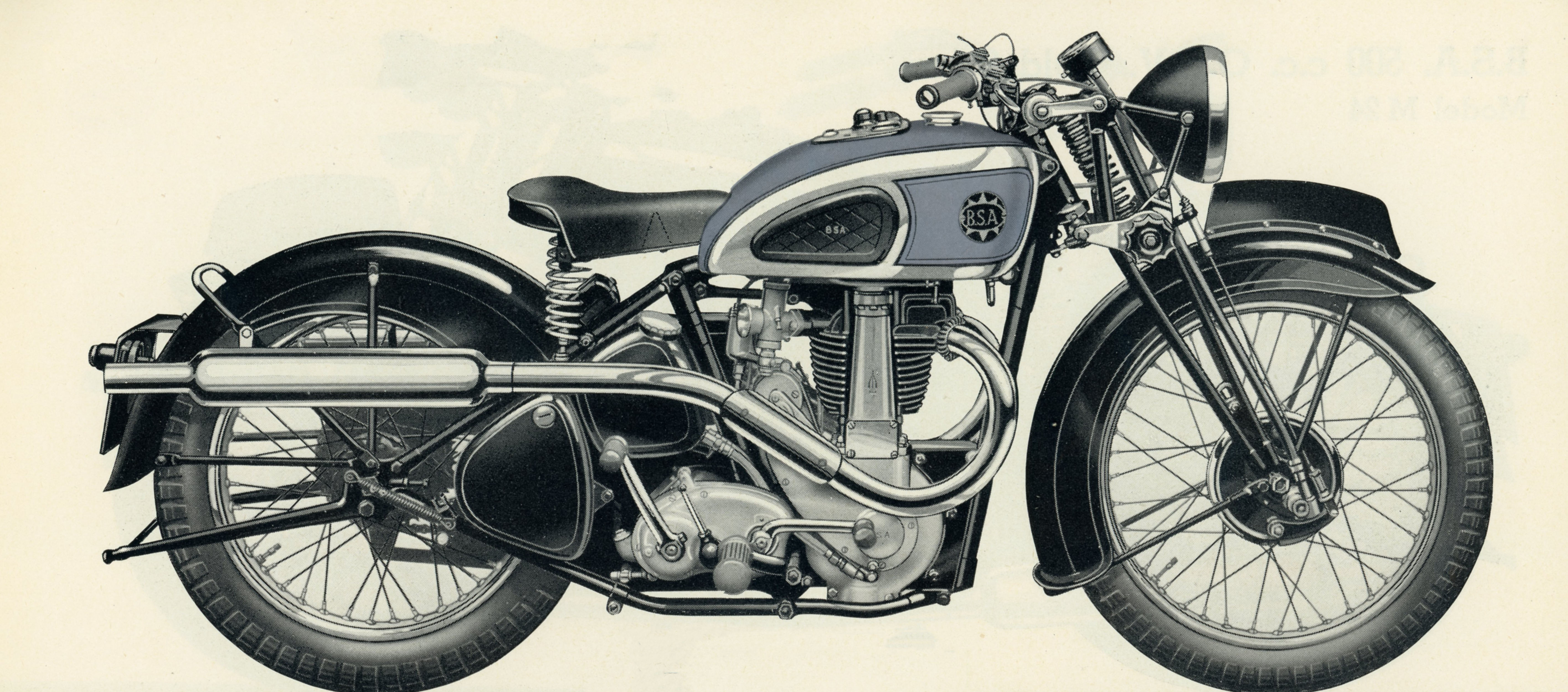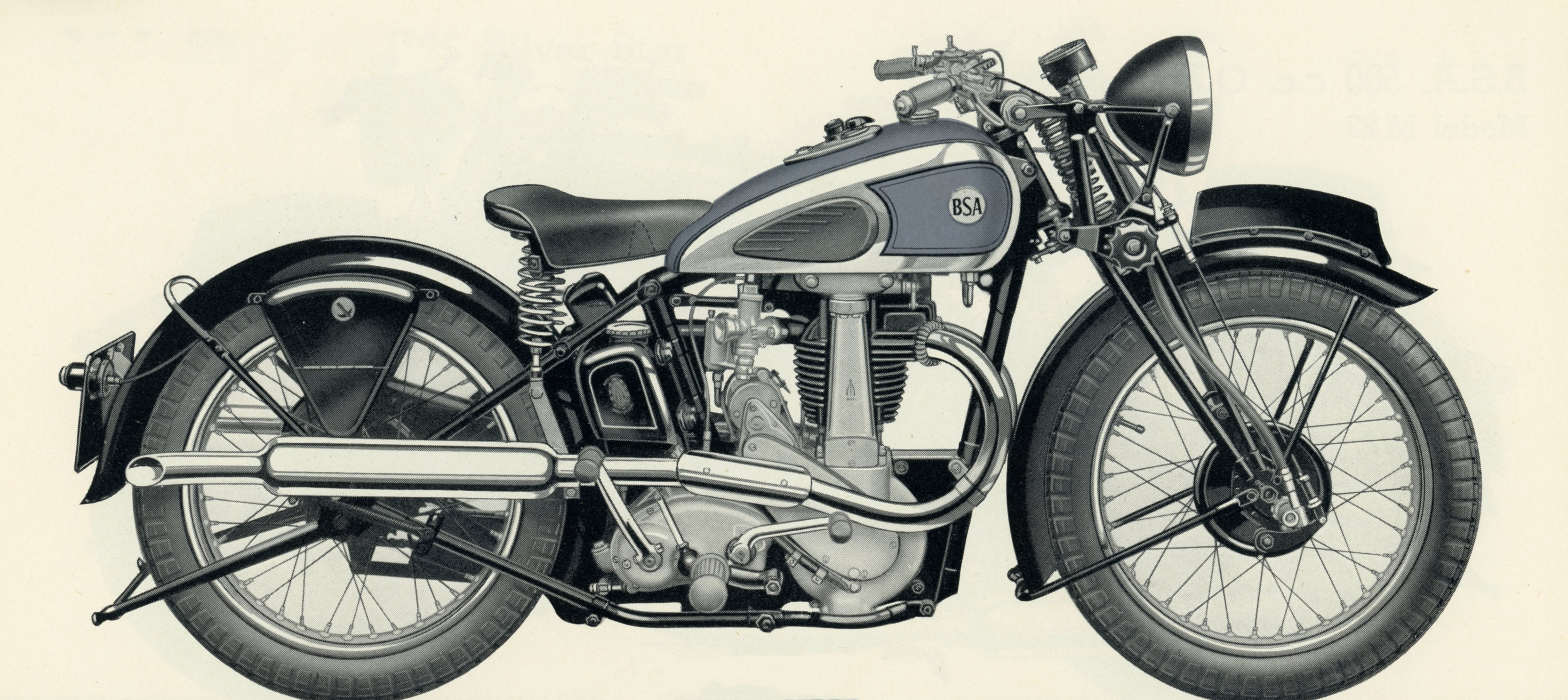 M23 Silver Star or 500 c.c. O.H.V. Silver Star The fast 500cc OHV model. it was the successor of the Empire Star. | black frame, chrome plated petrol tank with matt silver panels lined in red and black with instrument panel and the distinctive tank badges, foot change gearbox. |