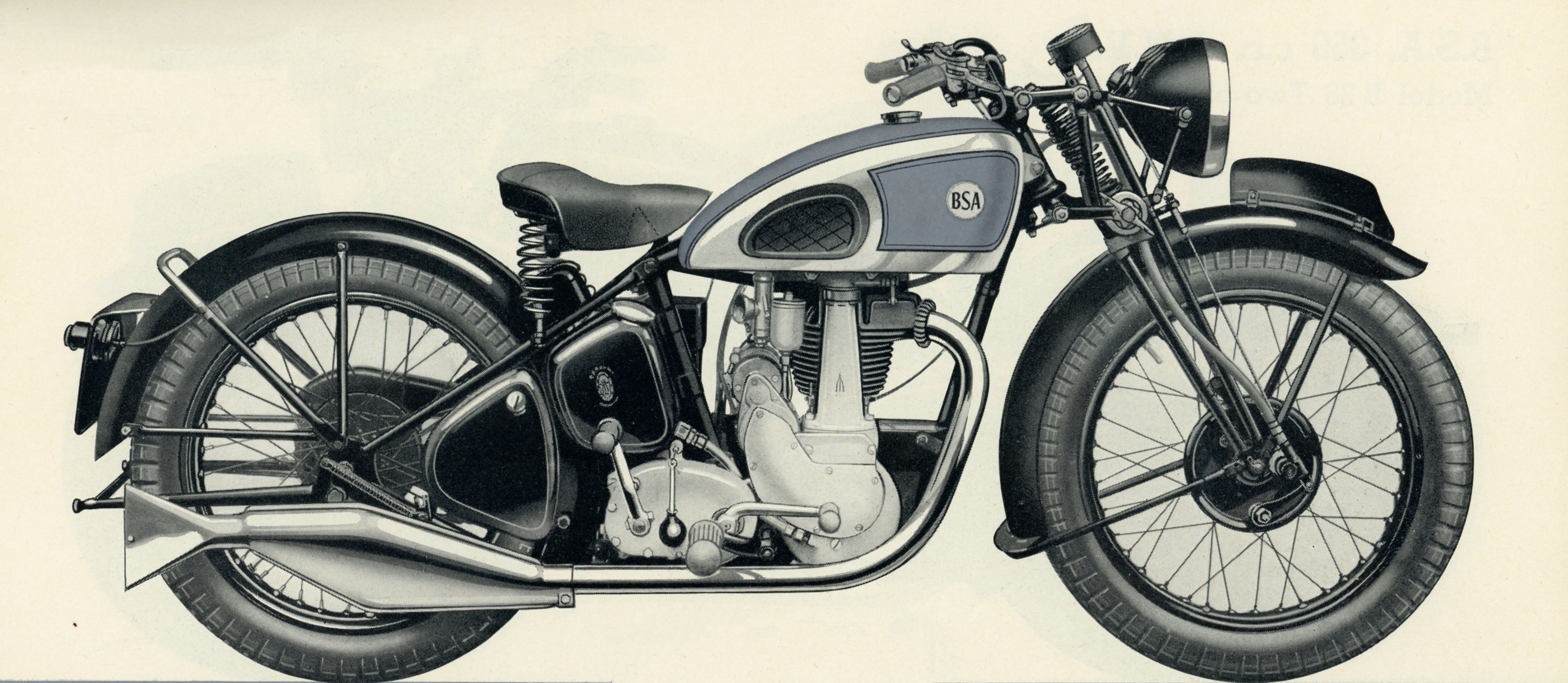 B24 Two Port or 350 c.c. O.H.V. Silver Star. The same model with two high level exhaust systems, which were in fashion at the time. | black frame, chrome plated petrol tank with matt silver panels lined in red and black with the distinctive tank badges, foot change gearbox. |